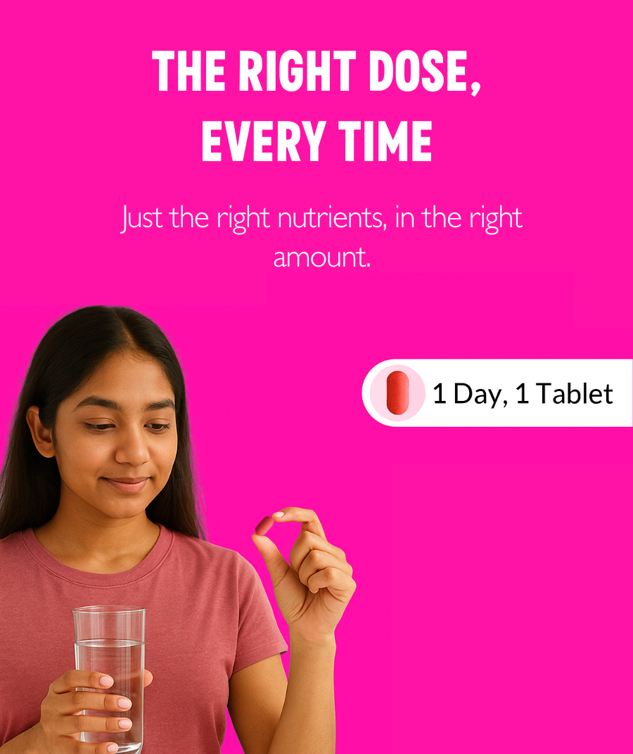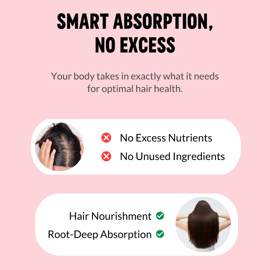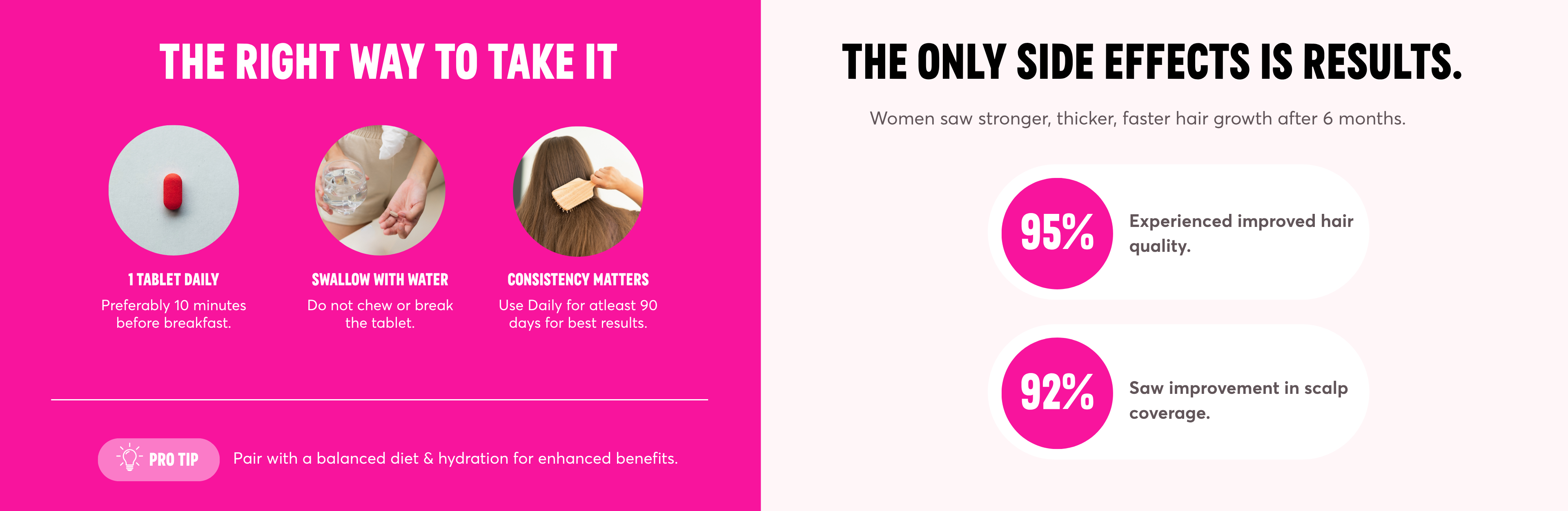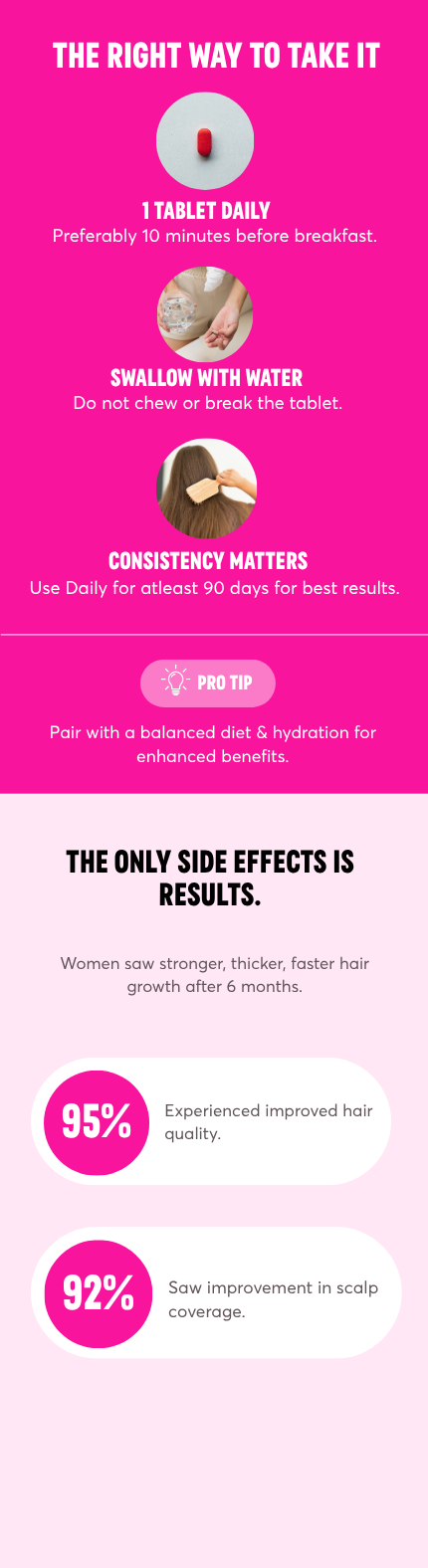 Our dermatologist-formulated hair health tablets are created specifically for women aged 18 and above dealing with hair thinning & hair fall. Our tablets target the underlying reasons, such as stress, lifestyle choices, and nutritional deficiencies, using ingredients that have undergone clinical tests. This scientifically proven cyclical therapy-formula supports visibly thicker, fuller, and stronger hair with growth you can feel. Just 1 tablet, once a day, fits seamlessly into your daily wellness routine—experience noticeable results in as little as 3-6 months. It’s 100% drug-free and safe for long-term use, giving your hair the love and nourishment it deserves.