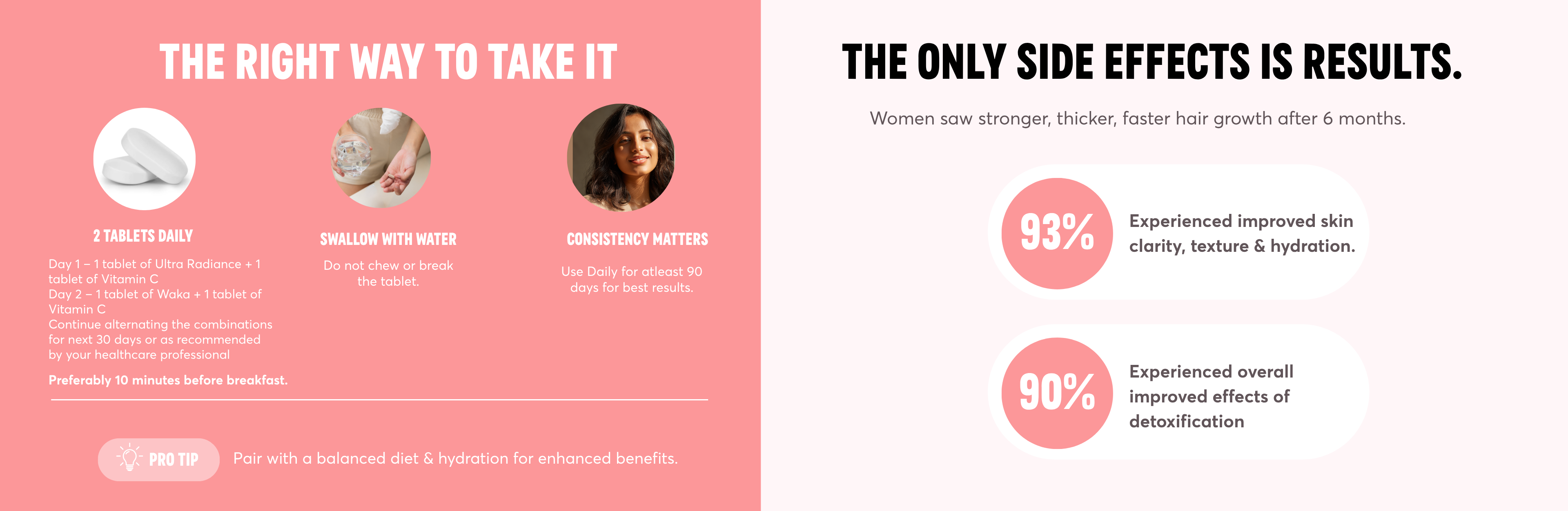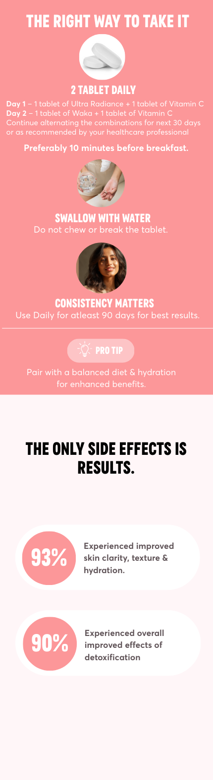 Take 1 tablet of Ultra Radiance + 1 Vitamin C tablet on Day 1, followed by 1 tablet of Waka + 1 Vitamin C tablet on Day 2.Continue alternating daily for 30 days or as recommended by your healthcare professional.